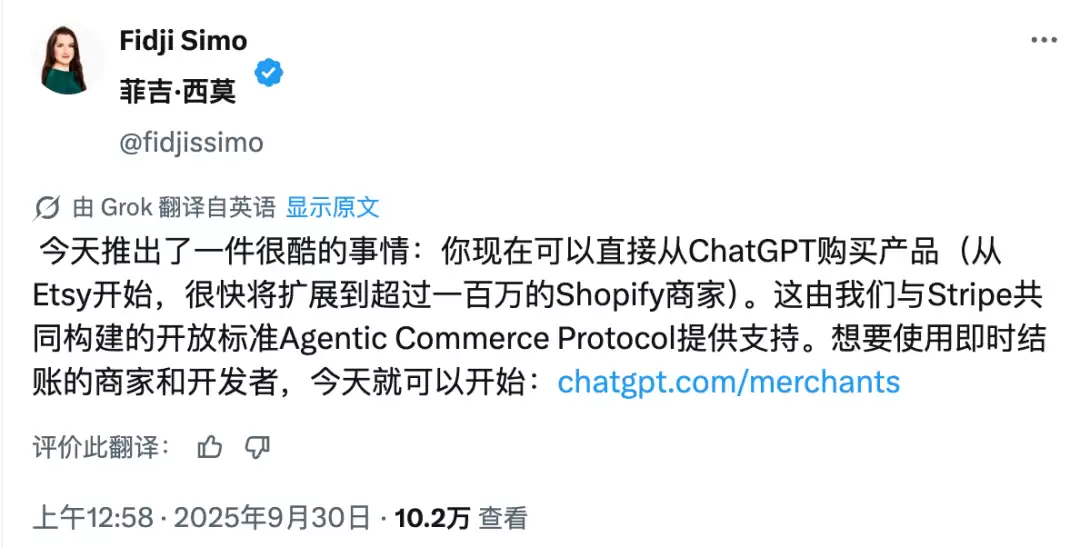 「我们希望让用户在 ChatGPT 中完成整个购物旅程更轻松, 同时也让商家和开发者能把这些对话直接转化为订单。」