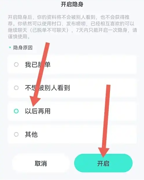 系统会弹出确认弹窗,需要选择适合自己的隐身原因,最后点击底部的【开启】按钮完成设置