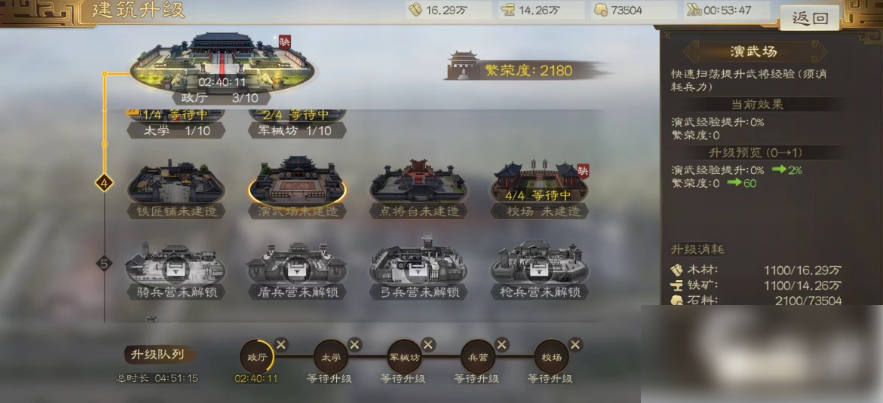 这两类建筑各具特色:演武场虽然需要消耗兵力进行扫荡,但经验获取效率极高;校场则无需任何消耗,采用挂机积累模式,特别适合在离线前安置武将,次日上线即可收获经验收益。其次是阵容扩容策略,游戏支持最多5人同时出战,但受限于前期统御值限制。建议优先升级政厅提升统御上限,解锁更多出战名额自然能显著增加总兵力规模。