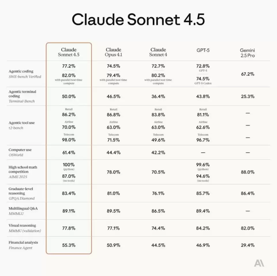 Anthropic表示,Claude Sonnet 4.5在多项指标上超越了OpenAI的GPT-5和谷歌的Gemini等主要竞争对手。Claude Sonnet 4.5在SWE-bench Verified基准测试中表现突出,得分达到82.0%,该测试用于评估AI解决GitHub仓库中真实世界软件工程问题的能力。相比较而言,Claude Opus 4.1在该项测试中的得分为79.4%;Claude Sonnet 4的得分为80.2%;GPT-5的得分为72.8%;Gemini 2.5 Pro的得分为67.2%。