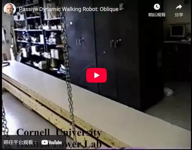 当前人形机器人的行走方式与人类截然不同。人类的身体是“富有弹性的弹簧式系统”,即便没有复杂的神经控制,也能维持行走状态。事实上,你可以看到纯机械结构的双足行走模型——无需电源,仅依靠自身的被动动力学,就能沿缓坡下行,通过“下山时获取重力势能”为行走提供机械动力。
