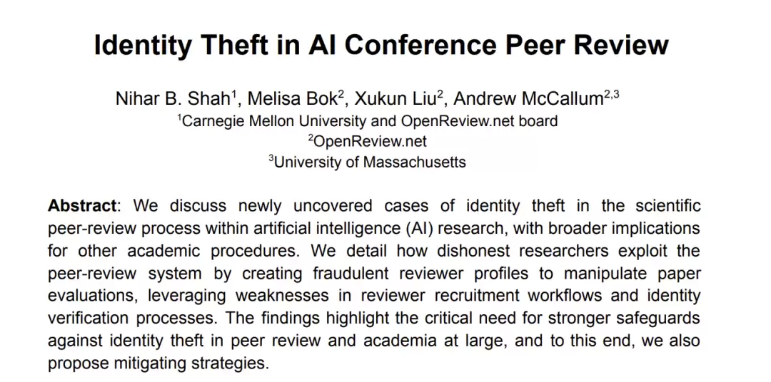 注:该报告由 Nihar B. Shah(卡内基梅隆大学,兼 OpenReview 董事会)、Melisa Bok、Liu Xukun、Andrew McCallum(马萨诸塞大学)联合署名;OpenReview 是为会议与期刊提供评审基础设施的非营利平台,已服务 2000 余个会议与工作坊,其中包含多数 AI 顶会。