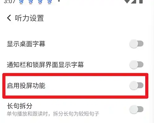 3. 进入【听力设置】后找到【启用投屏功能】,只需轻触右侧开关即可激活此功能