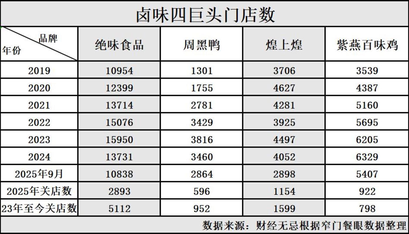 而同一时期的周黑鸭、煌上煌和紫燕百味鸡,各关店952家店、1599家店、798家店,四家卤味巨头,合计关店8461家。