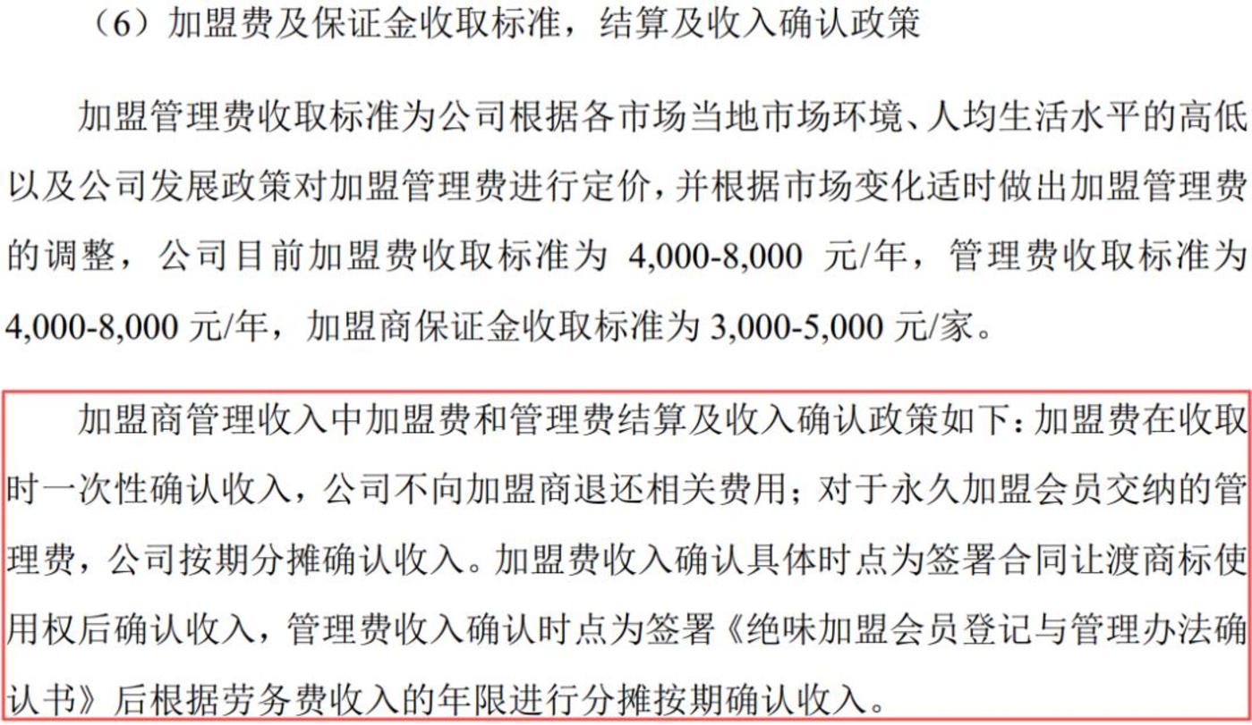 从绝味的招股书来看,公司明确列示的收入类别中只有“加盟费管理收入”,并未提及装修款。这说明在IPO时,公司和中介机构都认为装修业务不属于主营收入范畴。