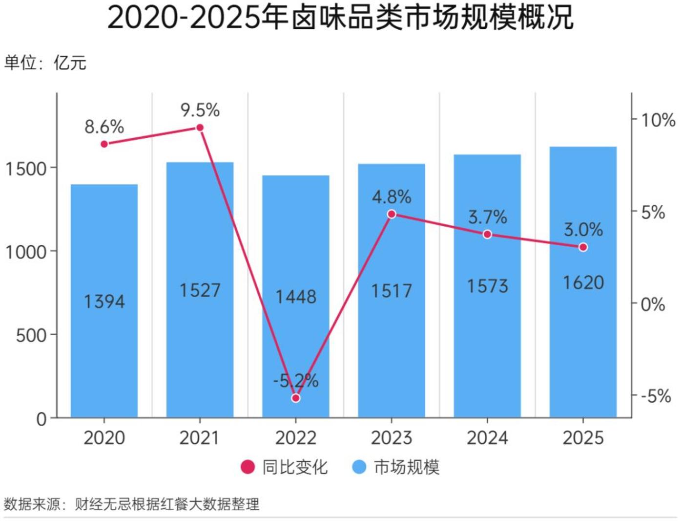 红餐产业研究院数据显示,2024年卤味品类市场规模为1573亿元,同比增速仅为3.7%;预计2025年将微增至1620亿元,增速进一步放缓。