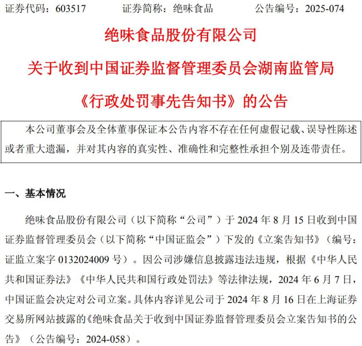 中国证监会湖南监管局决定对绝味食品责令改正、给予警告,并处以400万元罚款;