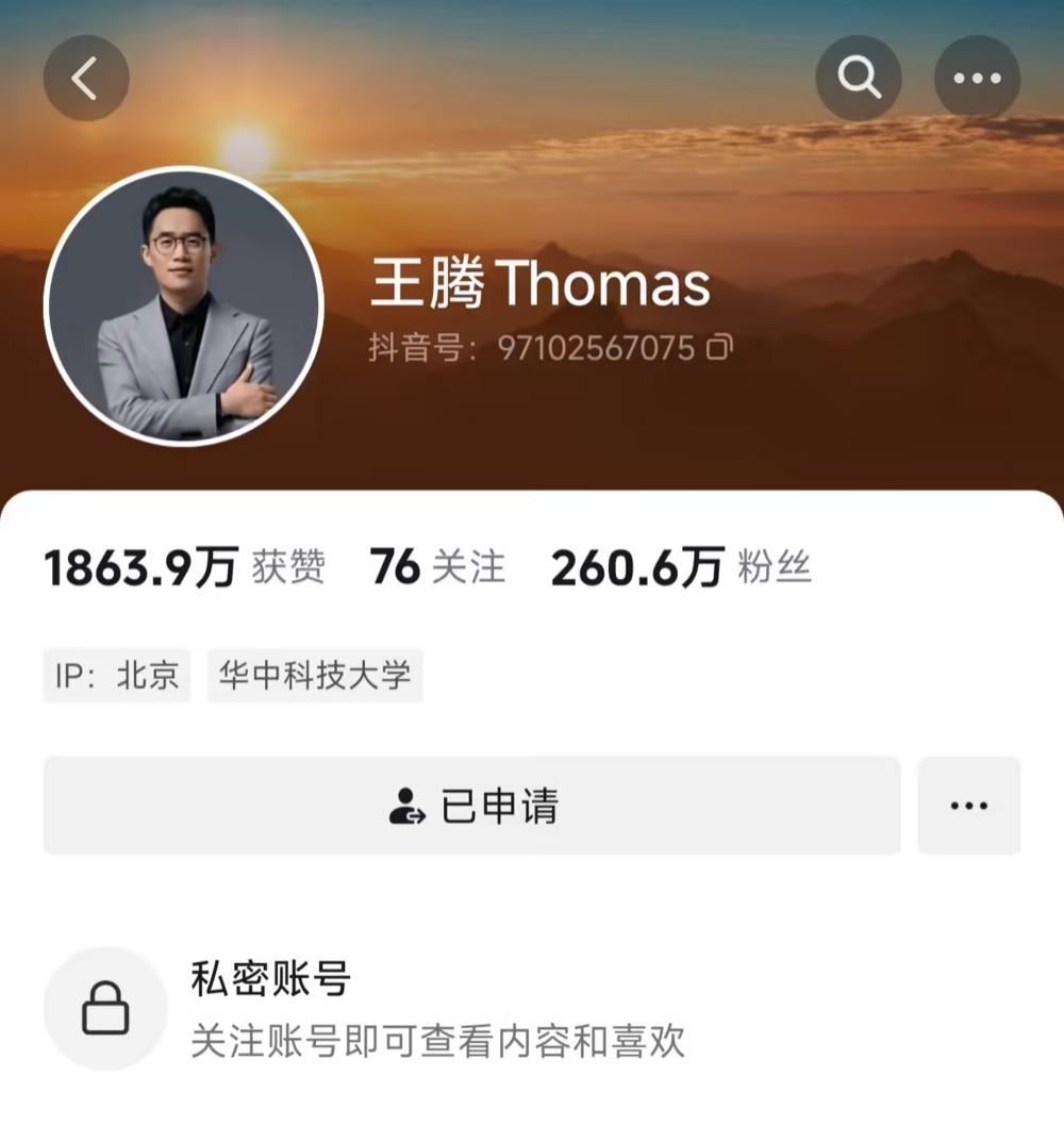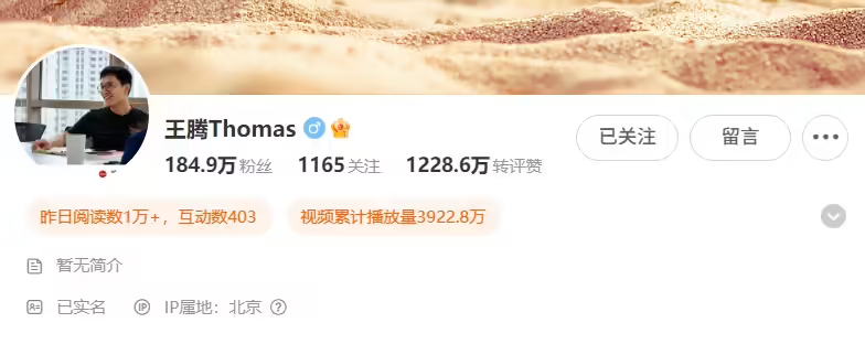 在离职消息确认后,记者发现王腾的社交媒体账号陆续出现异常状态:小红书账号已注销、快手账号被封停、抖音账号转为私密可见,微信视频号内容也已全部清空。目前仅微博账号保持正常展示状态,但其个人简介中的小米职务信息已被删除。