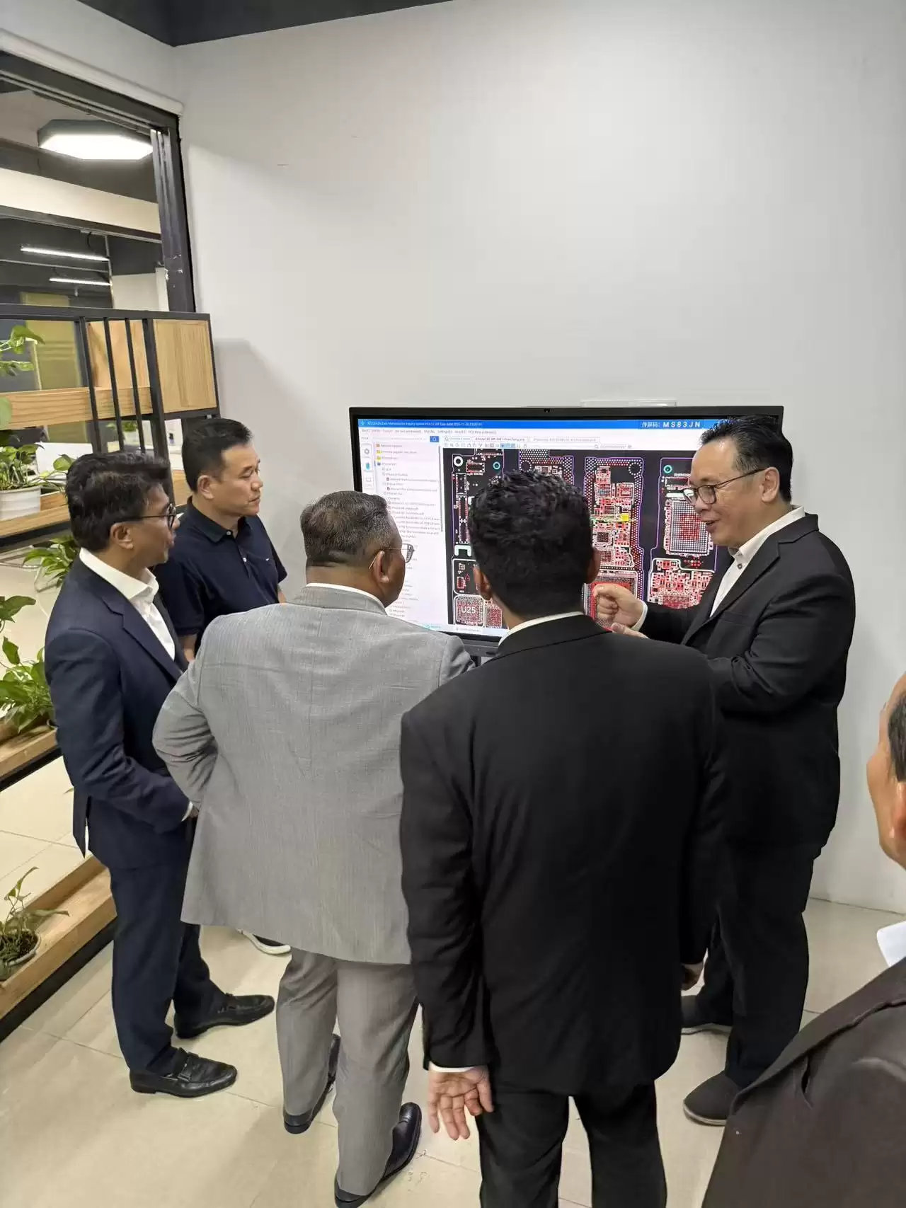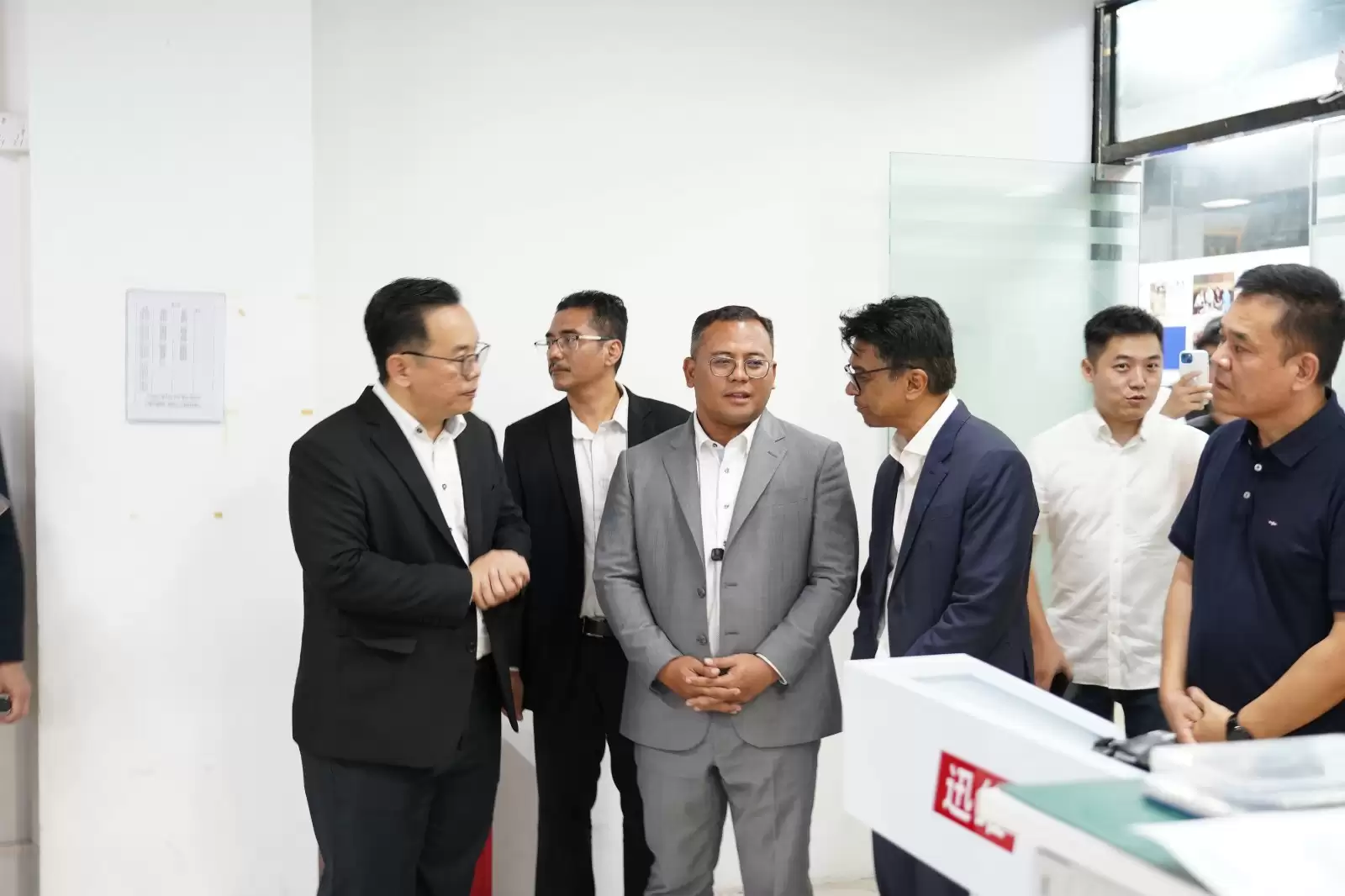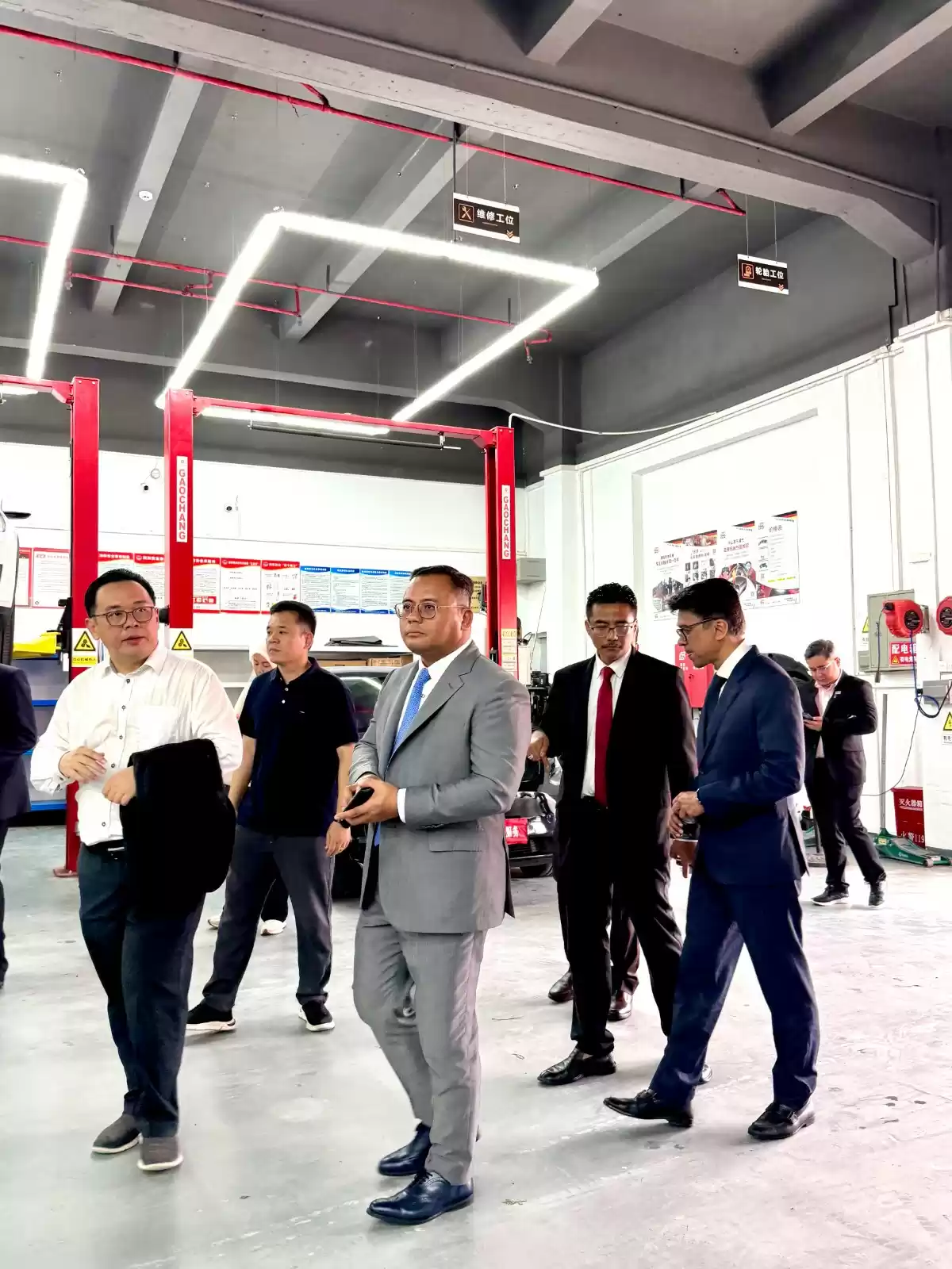 考察首日,代表团来到迅维科技位于宝安区的新能源汽车维修基地。州务大臣阿米鲁丁·沙利在迅维团队的陪同下,实地观摩了维修车间与实训中心。现场重点展示的特斯拉专用诊断工具及EV/PCB全套维修设备,其卓越的技术水平与标准化操作流程赢得了代表团的称赞。