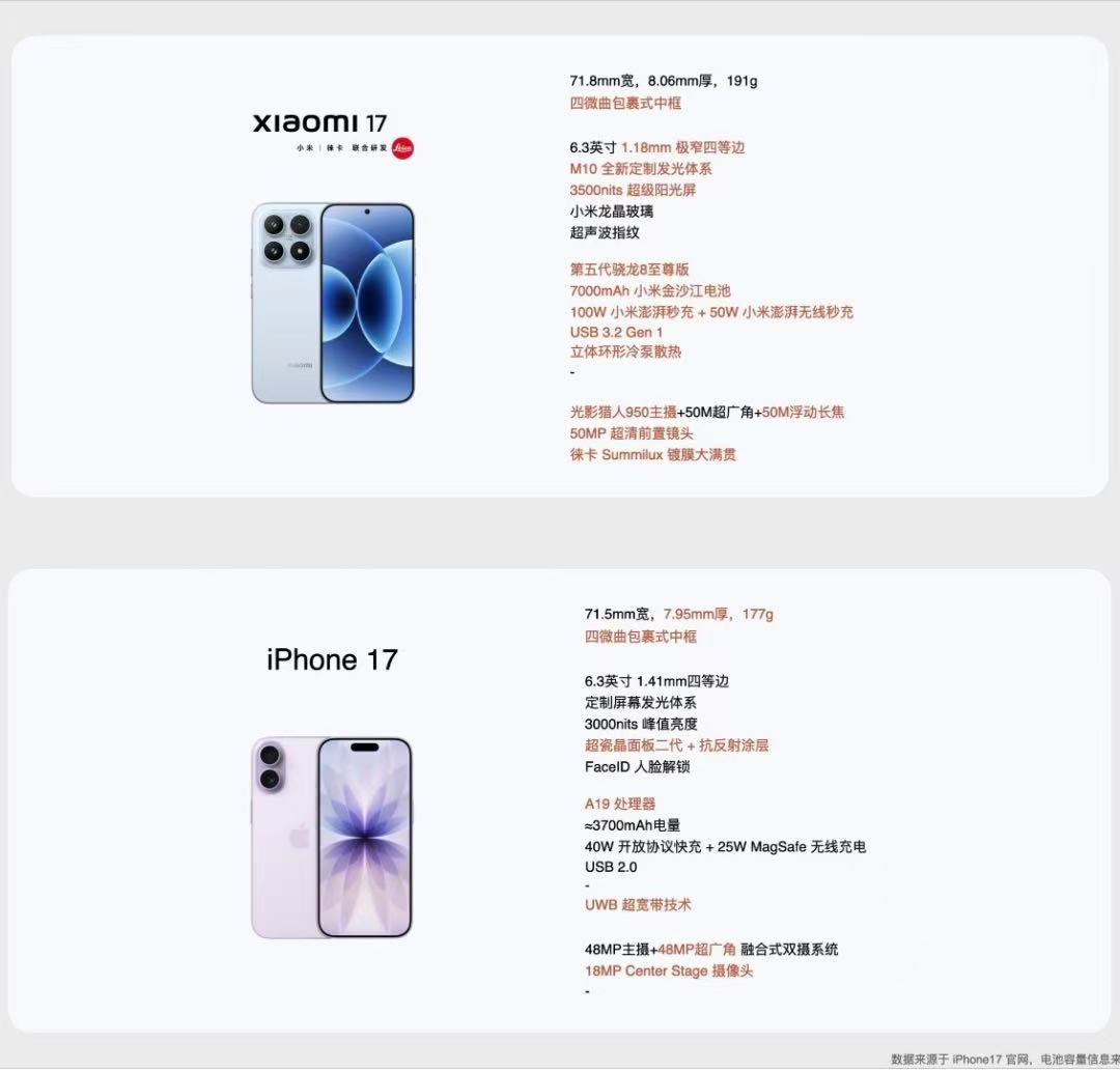 小米发布会当晚,雷军全场提了几十次苹果,把小米17和iPhone17进行全方位对比,被网友评价为:“雷军开了场iPhone发布会。”