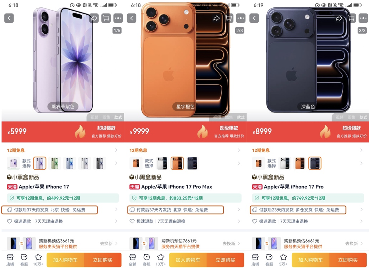 在发货速度方面,平台之间存在显著差距。以天猫为例,iPhone 17和iPhone 17 Pro Max的发货时间标注为“付款后37天内发货”,iPhone 17 Pro则为“付款后23天内发货”。这意味着,消费者在国庆期间下单,最快也要等到10月中下旬才能收到新机,对于追求即时满足感的消费者来说,这种漫长的等待无疑会严重影响购物体验。