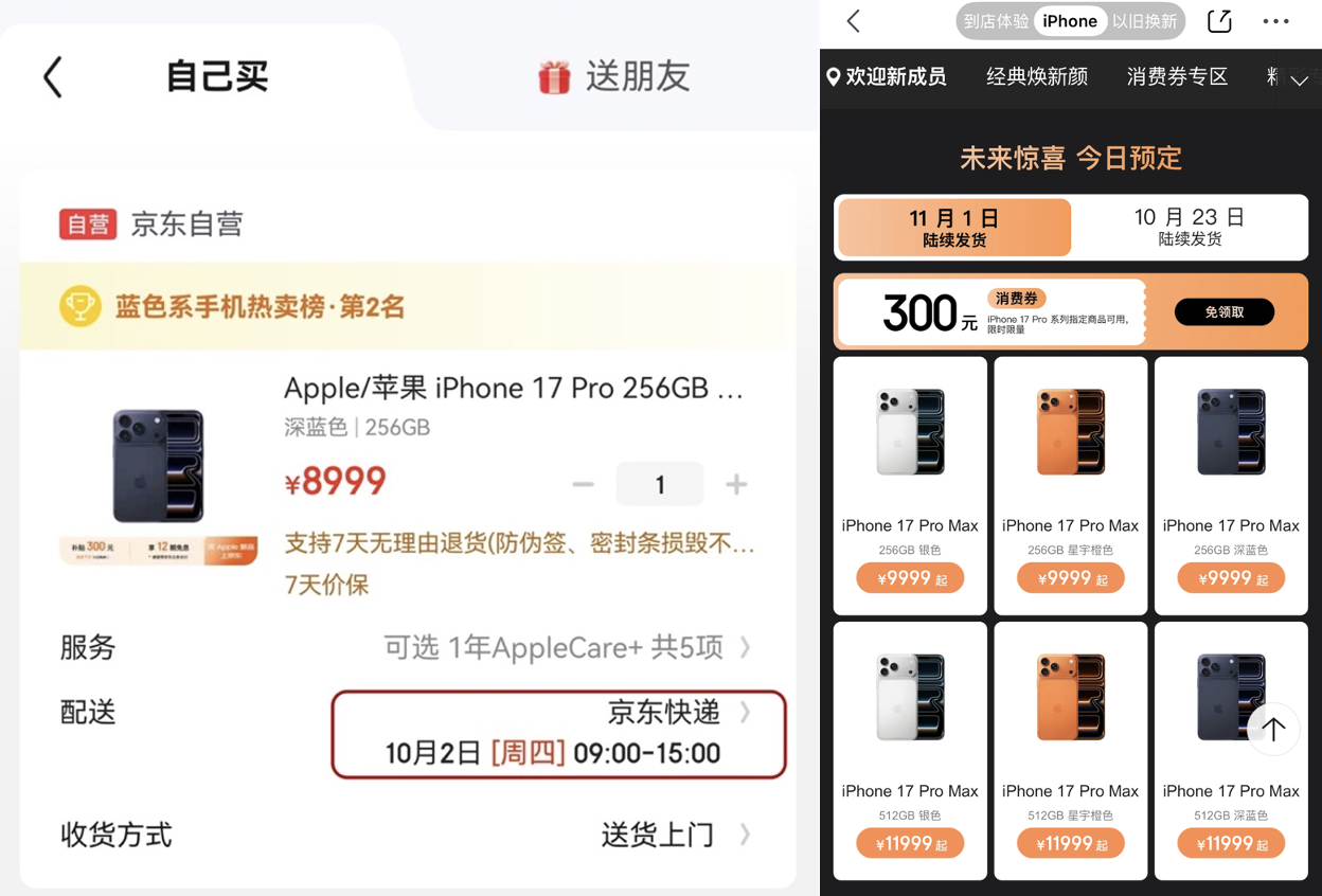 相比之下,国庆期间京东针对iPhone 17系列进行了大规模补货,部分热门机型如iPhone 17 Pro支持“当天下单、次日送达”,有效缩短了用户从下单到收货的周期,为希望在国庆假期中完成换机的用户提供了极大便利。iPhone 17 Pro Max国庆期间预定,京东也将于11月1日起陆续发货,相比天猫11月5日的发货时间提前了4天,到货时间更早。