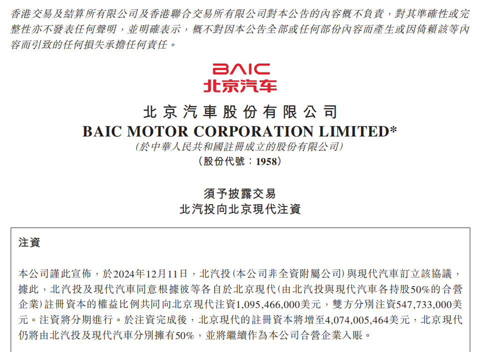 值得关注的是,2024年12月11日晚间,北京汽车发布公告称,当日北汽投与现代汽车订立协议,双方同意根据各自于北京现代注册资本的权益比例,共同向北京现代增资,总金额为10.95亿美元。此次增资将由双方各自出资约5.48亿美元,注资将分期进行。