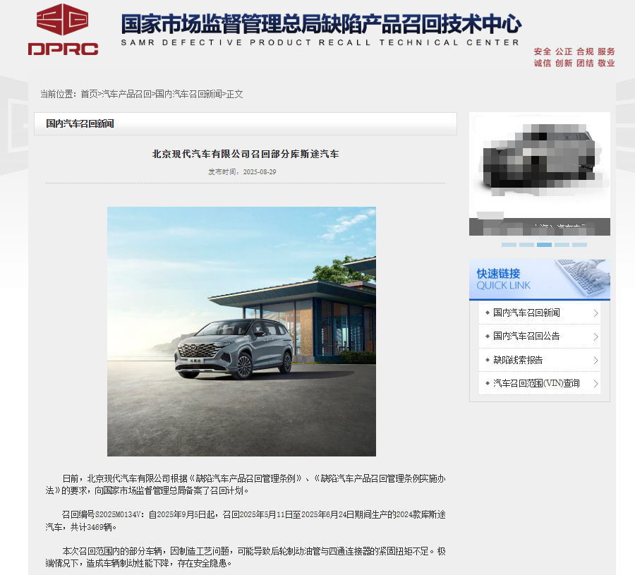 2025年8月29日,“国家市场监督管理总局缺陷产品召回技术中心”正式发布《北京现代汽车有限公司召回部分库斯途汽车》的消息。消息称,日前,北京现代汽车有限公司根据《缺陷汽车产品召回管理条例》《缺陷汽车产品召回管理条例实施办法》的要求,向国家市场监督管理总局备案了召回计划。