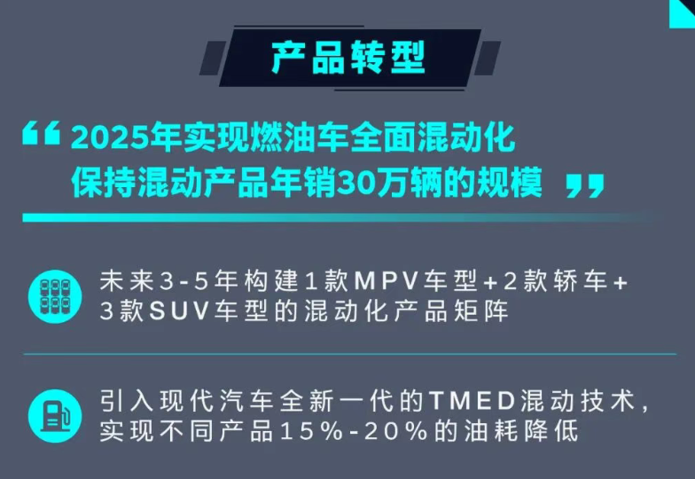 当时报道称,“根据计划,在产品转型方面,北京现代要在2025年实现燃油车全面混动化,未来3年-5年内构建1款MPV车型、2款轿车、3款SUV车型的混动化产品矩阵,达成混动产品年产销30万辆规模;加速引入纯电品牌艾尼氪(IONIQ),2024年推出专属EV车型,未来3年投放4-5款纯电车型,力争达成年产销20万辆规模,成为合资品牌电动车市场的‘领头羊’。”