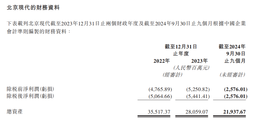 根据前述北汽投与现代汽车订立的协议,当时北京汽车发布的公告显示,2024年、2024年、2024年前三季度,北京现代净利润(除税后)分别为-50.65亿元、-54.41亿元、-25.76亿元。换言之,不到三年,北京现代累计亏损130.82亿元。