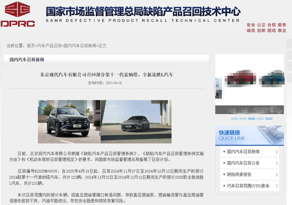 而在4个月前的2025年4月18日,“国家市场监督管理总局缺陷产品召回技术中心”正式发布《北京现代汽车有限公司召回部分第十一代索纳塔、全新途胜L汽车》的消息。
