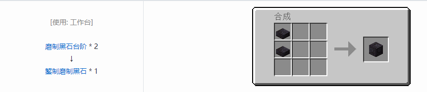 如果你想要获取这种装饰方块,可以通过合成获得:在工作台中放置2个磨制黑石台阶,一次性可以制作出1个錾制磨制黑石。