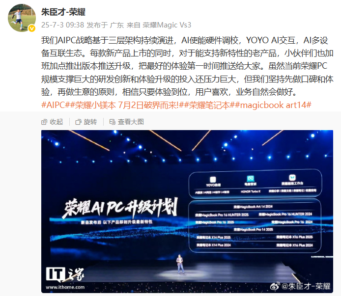 值得关注的是,朱臣才在今年7月曾阐述荣耀的AI PC战略,其核心包括三大技术支柱:AI驱动的硬件优化、YOYO智能交互系统,以及跨设备AI互联生态。荣耀承诺在推出新品的同时,也会为兼容新特性的旧款设备提供持续的系统升级支持。