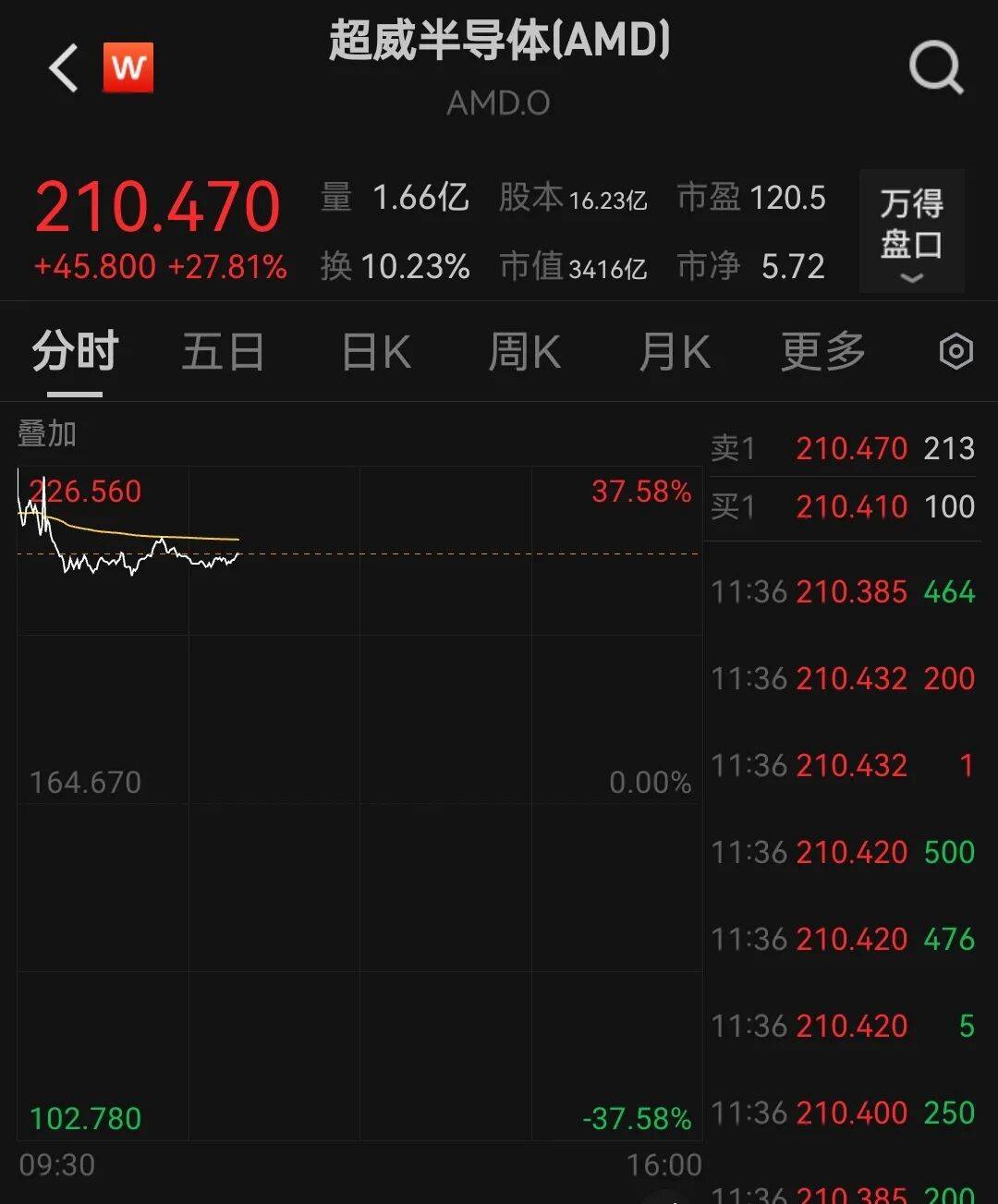 截至发稿,AMD股价报210.47美元/股,涨27.81%,市值约为3416亿美元。