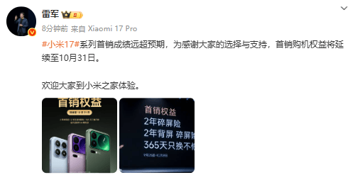 雷军宣布:小米17系列首销成绩超预期,购机权益延续至10月31日