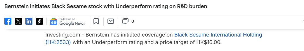 StockInvest.us指出,黑芝麻智能短期技术指标(如MACD)发出看空信号,长短期均线均呈空头排列,将其列为“卖出候选”。TipRanks显示,当前黑芝麻智能技术情绪信号为“强烈卖出”,反映市场对其短期缺乏信心。伯恩斯坦(Bernstein)给予黑芝麻智能“跑输大市”评级,目标价为16港元,低于当前股价。图源:TipRanks