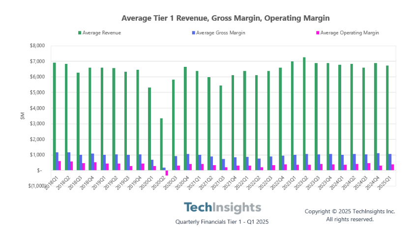 主机厂面临的降本压力传导至Tier1厂商:TechInsights报告显示,2025年Q1,Tier1厂商营收环比2024年第四季度下降约3%,尽管第二季度环比增长6%,但在成本上升、原材料价格波动、研发投入及关税压力持续的背景下,盈利依然面临严峻考验。