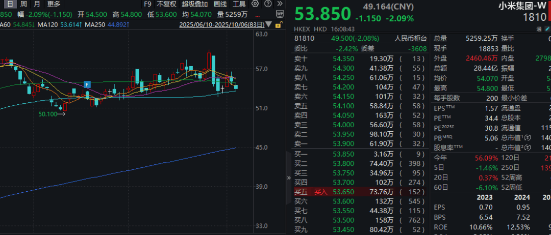 资本市场方面,小米集团-W(港股)近期股价表现相对疲软。10月6日收盘报53.85港元,当日下跌2.09%。进入10月以来,公司股价累计下跌0.28%,同期恒生指数上涨0.38%,恒生科技指数上涨1.31%,形成明显对比。