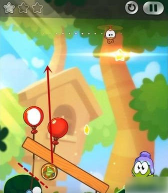 糖果上升后被Roto抓住,戳破气球!看准时间点击Roto使糖果能轻松收集星星并掉进绿色怪物的嘴巴里。