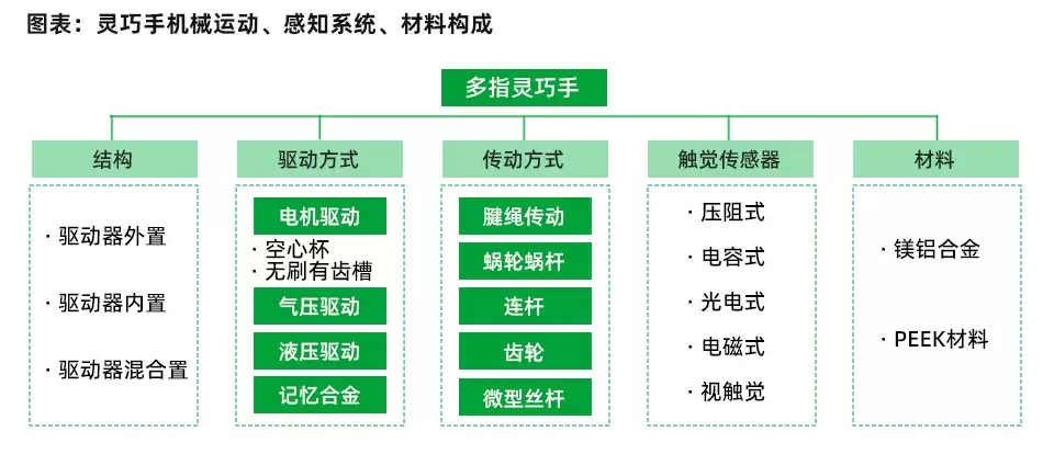 灵巧手最核心的部分在于它的机械和结构设计,可分为结构形式、驱动方式、传动方式、感知方式和材料等多方面。当前,灵巧手行业还未形成统一的技术标准,多家技术路线并存,对于哪一种技术路线更有优势尚无定论,这种“百家争鸣”的局面,尤其体现在最关键的三大部件上——驱动方式、传动方式和传感器。