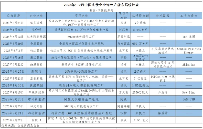 华夏能源网不完全统计,2025年以来至少有15家中国光伏企业公布在海外建厂计划,投资总规模超204亿元,中东及周边地区是最受青睐的出海热土。