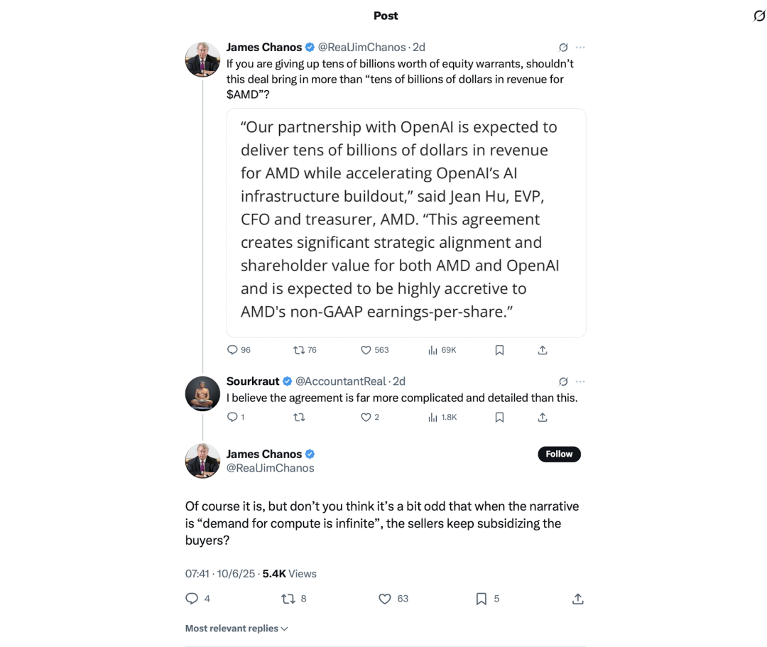 知名空头吉姆·查诺斯(Jim Chanos)在社交媒体X上写道,关于AMD交易:“当’计算需求无限’的叙事盛行时,卖家却在不断补贴买家,你不觉得有点奇怪吗?”