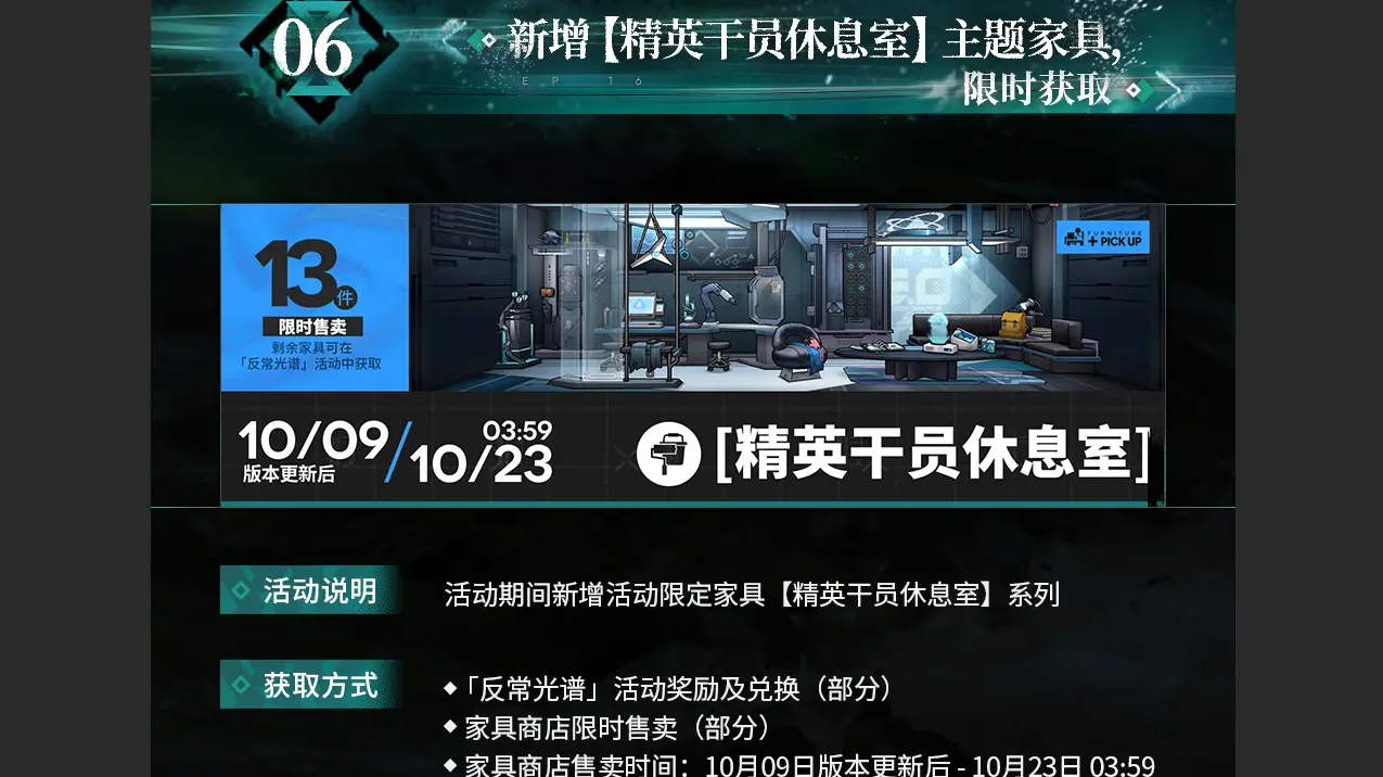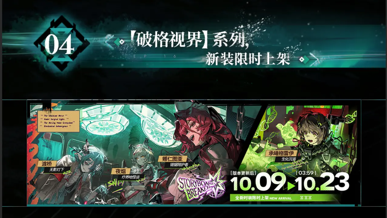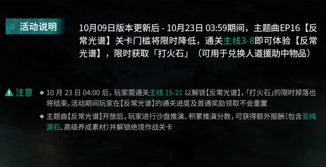 10月09日版本更新后 - 10月23日 03:59期间,主题曲EP16【反常光谱】关卡门槛将限时降低,通关主线3-8即可体验【反常光谱】,限时获取「打火石」(可用于兑换人道援助中物品)