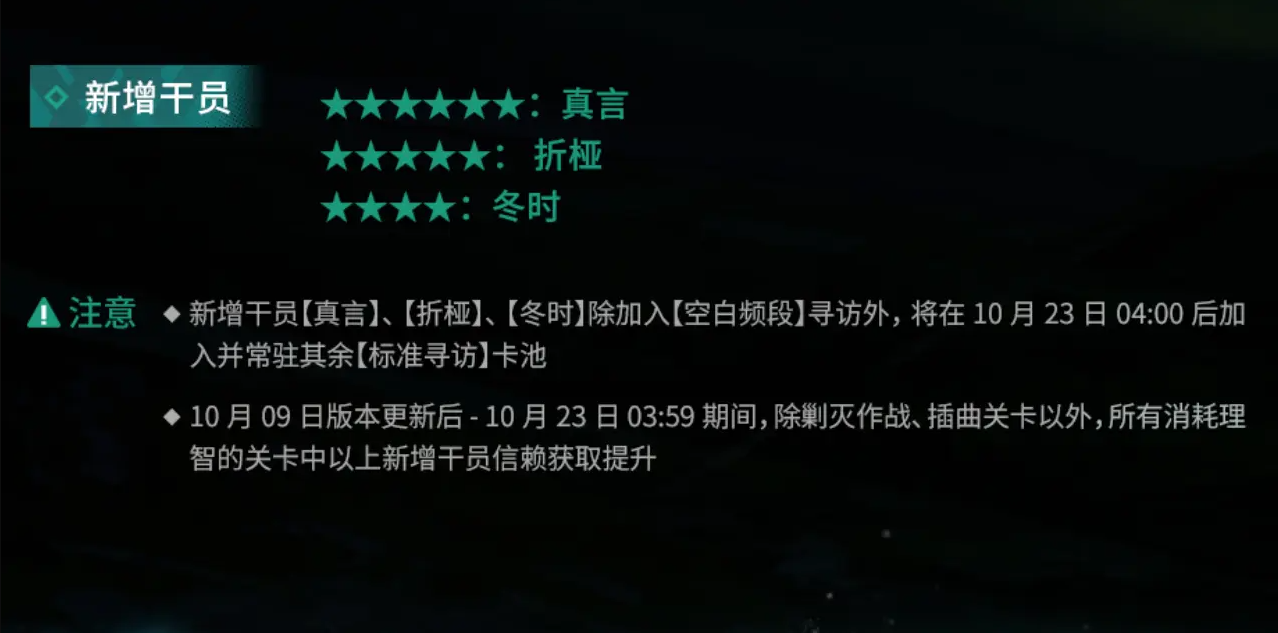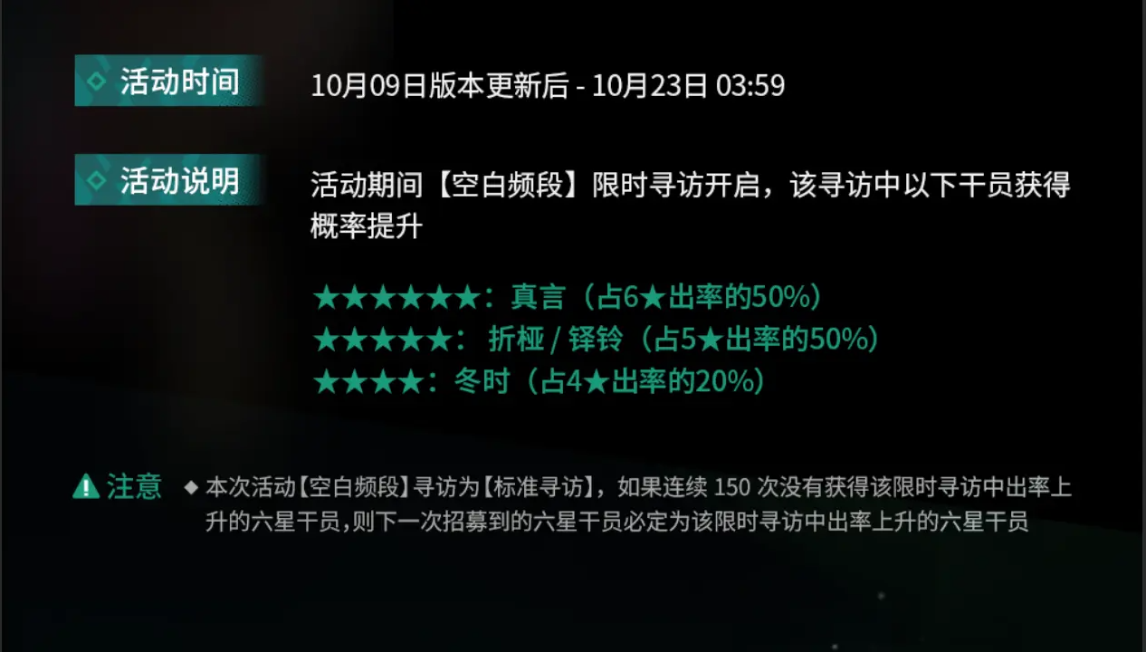 活动期间【空白频段】限时寻访开启,该寻访中以下干员获得概率提升