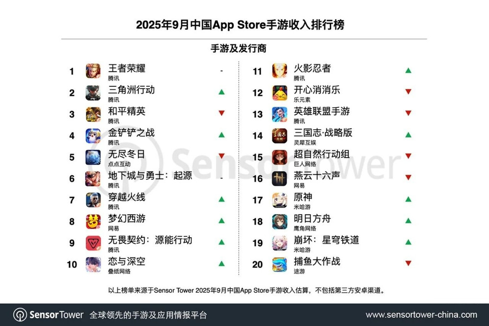 SensorTower发布2025年9月中国手游iOS收入榜:腾讯包揽前四