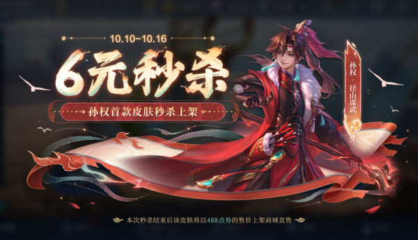 *孙权-径山谋武皮肤皮肤将于10月10日0:00-10月16日23:59开放碎片商店兑换,兑换价格:48皮肤碎片