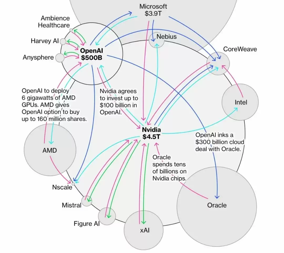 英伟达的策略是向AI公司提供算力支持——有时直接供给,有时通过类似“英伟达-甲骨文-OpenAI”的循环架构——从而回收前期投资。