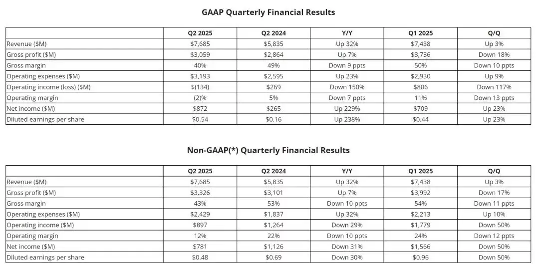 AMD虽与英伟达尚有差距,但AMD势头正盛。根据相关财报数据显示,AMD在2025年第二季度营收为76.85亿美元,较上年同期的58.35亿美元增长32%,较上一季度的74.38亿美元增长3%。