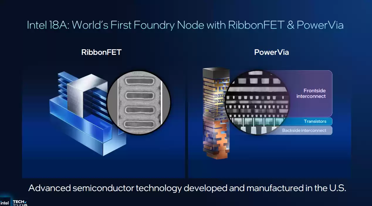 Panther Lake是首个采用英特尔的Intel 18A工艺制造的消费级产品平台,作为英特尔目前最先进的量产制程,Intel 18A工艺具有两大全新特性:RibbonFET环绕栅极晶体管和PowerVia背面供电。