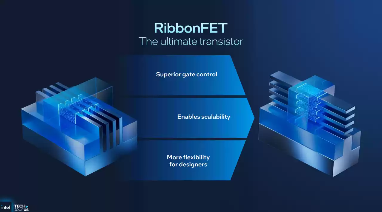 其中,RibbonFET环绕栅极晶体管是英特尔为2nm及以下制程所准备的一项新技术,用新的晶体管架构取代了传统的FinFET架构,避免因工艺升级所带来的漏电、性能不稳等问题。