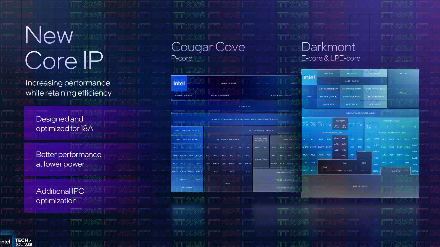 除了采用新一代的模块化设计外,Panther Lake也全面升级了大小核架构,引入全新的性能核Cougar Cove和效率核Darkmont。而Cougar Cove其实就是下一代Nova Lake架构的性能核,对比此前的大核,在IPC、主频等方面都有显著提升,大家可以期待一下这颗性能核在游戏等高负载应用上的表现。