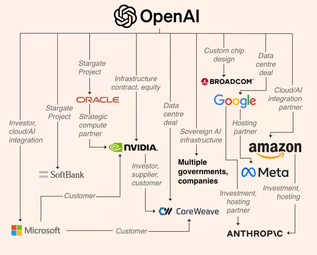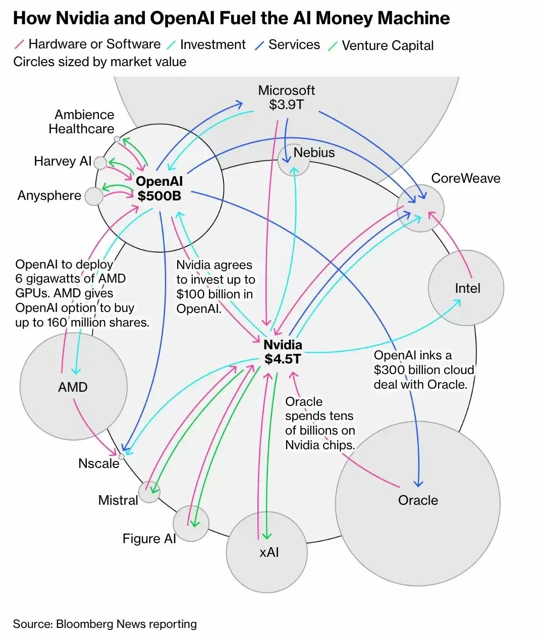 短短两周内,OpenAI、英伟达、AMD、甲骨文与xAI之间的巨额投资与合作,掀起了AI史上罕见的资本风暴。从英伟达的千亿美元投资,到OpenAI的芯片采购与数据中心扩张,资金在企业间循环流动,形成了一个封闭的资本回路。表面上看,这是产业协同与技术加速,实则暗藏泡沫风险。