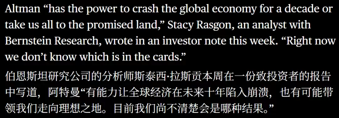 Bernstein分析师Stacy Rasgon甚至写道:「奥特曼可能带我们进入一个全新的经济纪元,也可能让世界陷入长达十年的回调期。」