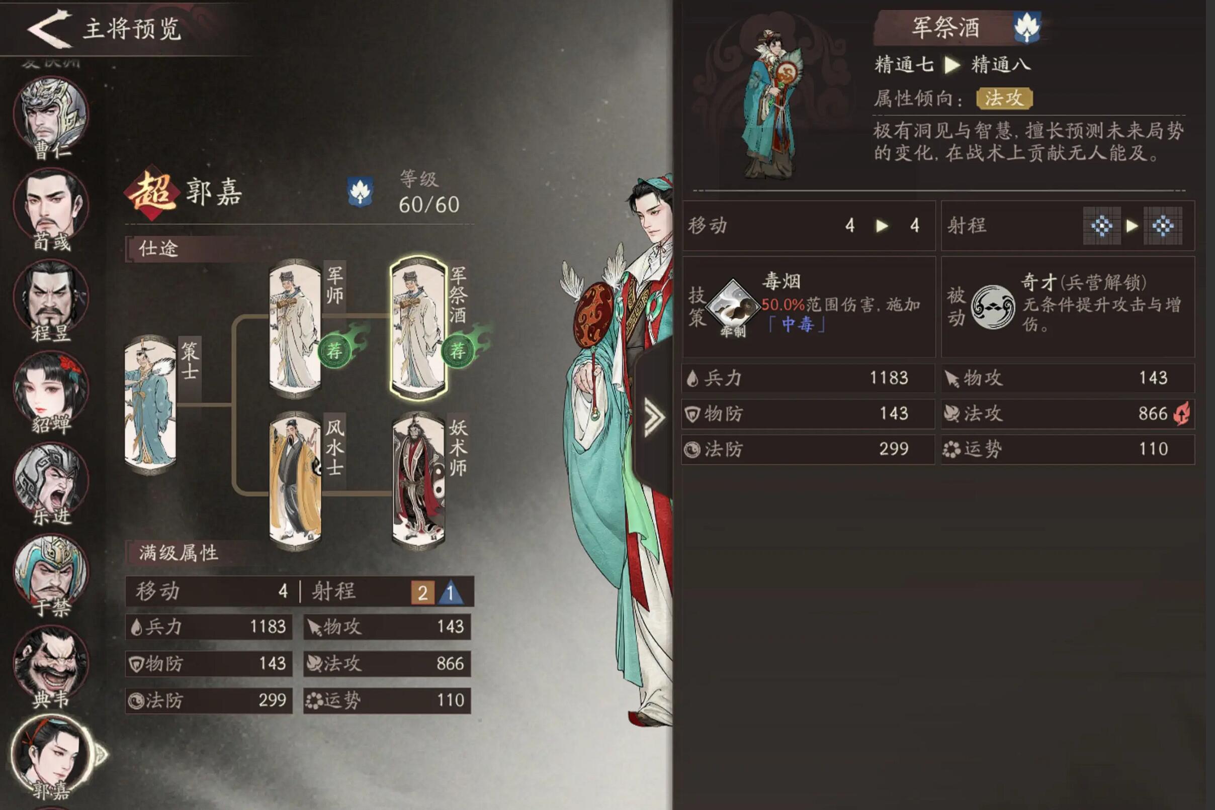 控制型可以选择类型比较少,但是强度还是非常不错的,它们就是郭嘉和贾诩,郭嘉的料敌机先能造成菱形范围松懈与伤害,距离越远伤害越高(最高+40%),搭配副将戏志才实测能一直输出,就是血掉得快得注意,二者形成的永动机组合在持久战中表现非常强势。贾诩通过伪报回退敌人行动并附加45%易伤,控制最好还是要手动操作,四胜决机技能可封敌技能,适合打断敌方节奏,6龙赠送的他培养成本低。