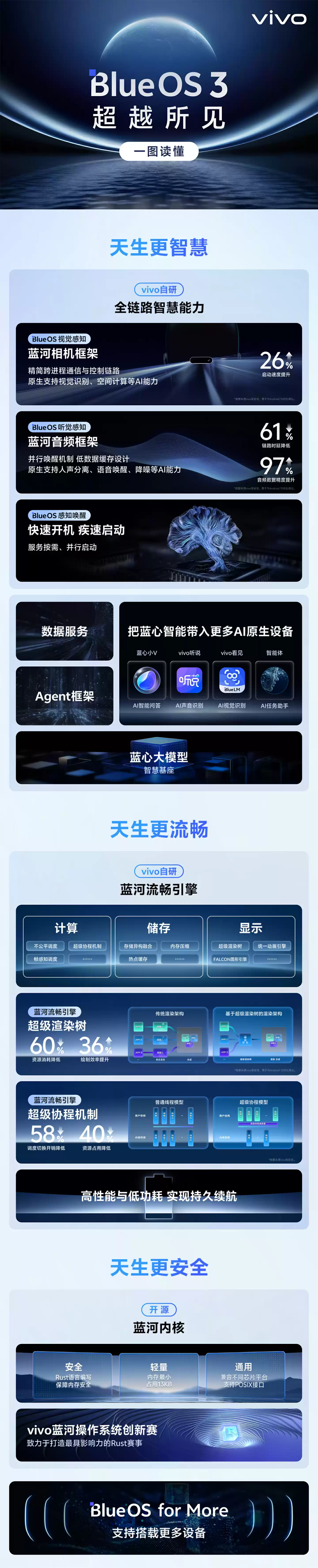 技术指标显示,蓝河OS 3内置的创新相机框架可将启动速度提升26%,音频框架则能降低61%的链路时延并提升97%的音频数据精度。系统还配备蓝河流畅引擎,其中"超级渲染树"技术减少60%资源消耗的同时提升36%绘制效率,"超级协程机制"有效降低了58%的调度切换开销和40%的资源占用。
