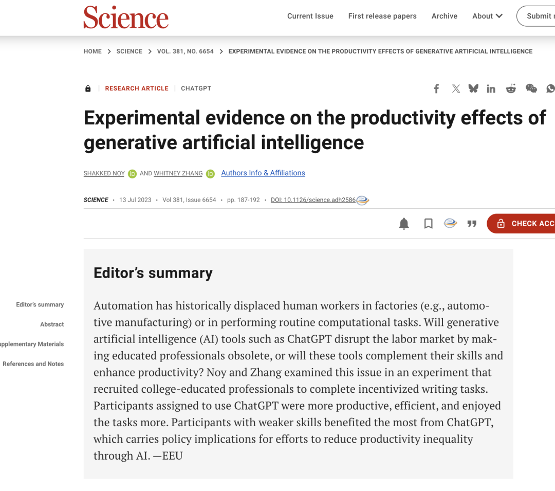 Science期刊的编辑对此总结道,“技能较弱的参与者从ChatGPT中获益最多,这一点对于未来旨在通过AI来减少生产力不平等的政策具有重要启示。”