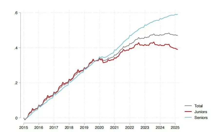 数据显示,2015到2024年间,初级和高级岗位的就业增长曲线基本保持一致,但从2024年开始,两者开始出现分叉:高级岗位继续向上增长,初级岗位则开始掉头向下。