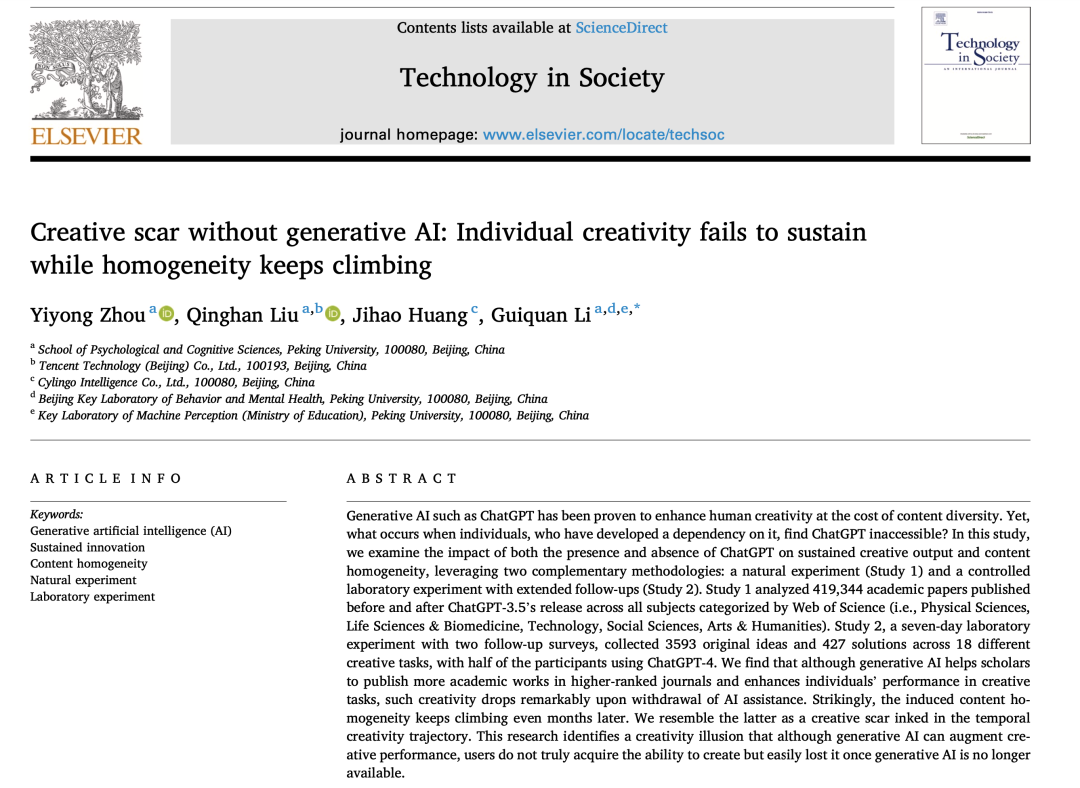 Zhou, Y., Liu, Q., Huang, J., & Li, G. (2025). Creative scar without generative AI: Individual creativity fails to sustain while homogeneity keeps climbing.Technology in Society, 103087.
