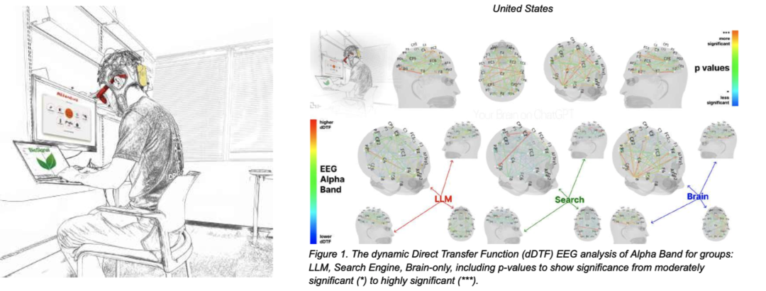 尤其值得一提的是,麻省理工学院的研究团队通过脑电图(EEG)技术直接观测了个体的大脑,发现使用ChatGPT的学生组,其大脑活动水平远低于仅靠自己思考或使用搜索引擎的小组。