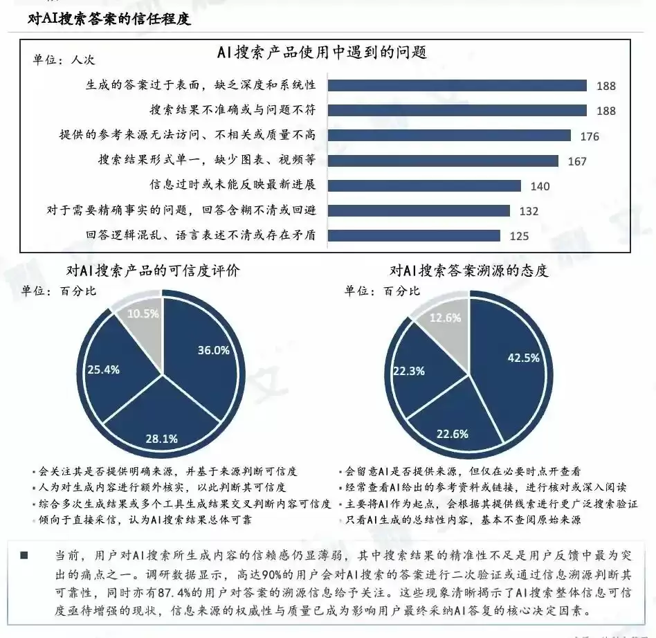 事实上,当前大部分用户对 AI 搜索信息仍保持着高度警惕。调研数据显示,高达 90% 的用户会对 AI 搜索给出的答案进行二次验证,另有 87.4% 的用户会特意关注答案的溯源信息。